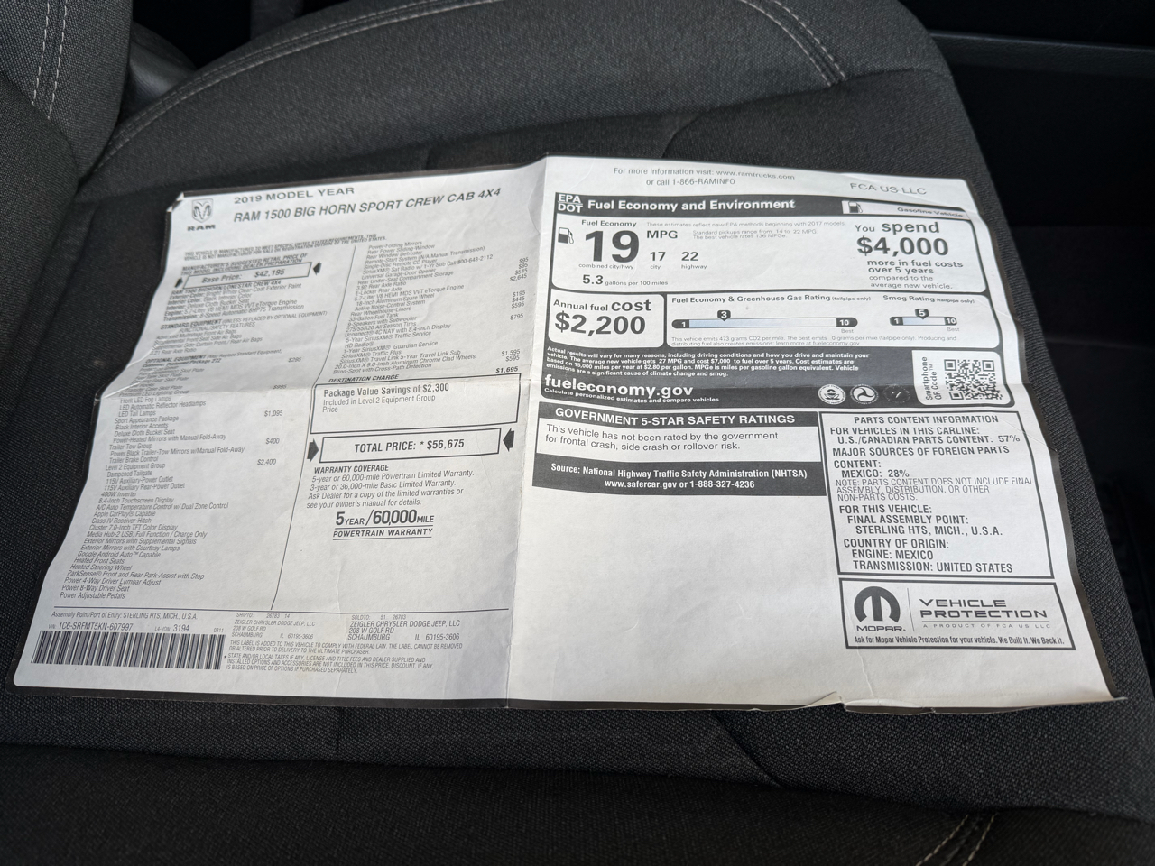 2 OWNER...CLEAN AUTOCHECK VEHICLE HISTORY REPORT...2019 RAM 1500 BIG HORN CREW CAB 4X4 6' 4" BOX...5.7L HEMI MDS VVT ETORQUE...8 SPD AUTOMATIC TRANSMISSION (8HP75)...3.92 REAR AXLE RATIO...E LOCKER REAR AXLE...7,100 LB GVWR...1,740 MAX PAYLOAD...33 GALLON FUEL TANK...DELUXE BLACK COLTH SEATS...KEYLESS ENTRY...PUSH BUTTON START...REMOTE START...POWER WINDOWS...POWER LOCKS...POWER MIRRORS...TRUCKS FOR SALE...U CONNECT 4...8.4" TOUCH SCREEN STEREO...BLUETOOTH...SINGLE DISC REMOTE CD PLAYER...9 AMPLIFIED SPEAKERS WITH SUBWOOFER...NAVIGATION...PARKVIEW BACK UP CAMERA...PARKSENSE FRONT AND REAR SENSORS...BLIND SPOT & CROSS PATH DECTECTION...CLASS III TOWING EQUIPMENT...TRAILER BRAKE CONTROLLER...20 INCH CHROME CLAD ALLOY...PREMIUM LIGHTING GROUP...PROTECTION GROUP...TRAILER TOW GROUP...SPORT APPEARANCE PACKAGE...BIG HORN LEVEL 2 EQUIPMENT GROUP...MSRP $55,595