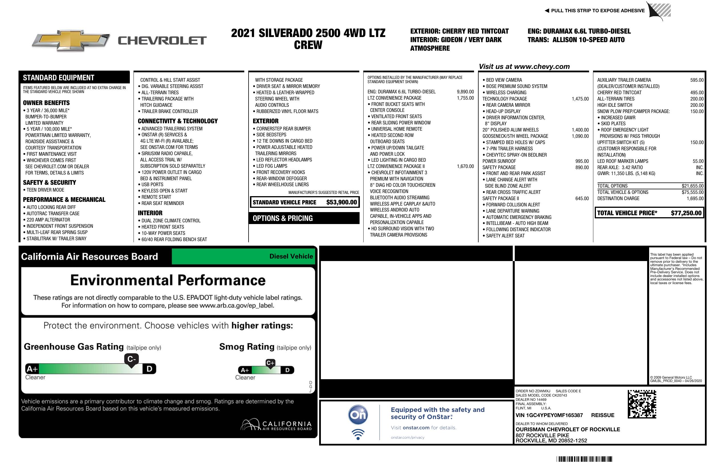 ONE OWNER...ACCIDENT FREE...2021 CHEVY 2500HD CREW CAB LTZ 4X4...6.6L DURAMAX DIESEL...10 SPD ALLISON AUTOMATIC TRANSMISSION...3.42 AXLE RATIO...11,350 LB GVWR...CHERRY RED TINTCOAT...LEATHER INTERIOR...DUAL POWER FRONT SEATS...DUAL HEATED AND COOLED FRONT SEATS...HEATED REAR SEATS...HEATED STEERING WHEEL...PUSH BUTTON START...REMOTE KEYLESS ENTRY...POWER WINDOWS...POWER LOCKS...POWER TOW MIRRORS...DIESEL TRUCKS FOR SALE...STEERING WHEEL MOUNTED AUDIO AND CRUISE CONTROL...POWER REAR SLIDING WINDOW...CHEVY INFOTAINMENT 3 PREMIUM WITH NAVIGATION...8" TOUCHSCREEN STEREO...BOSE PREMIUM SOUND SYSTEM...BLUETOOTH...APPLE CARPLAY...HD SURROUND VISION CAMERA...BED VIEW CAMERA...POWER SUNROOF...LTZ CONVENIENCE PACKAGE II...TECHNOLOGY PACKAGE...SAFETY PACKAGE II...FACTORY TRAILER HITCH...FACTORY TRAILER BRAKE CONTROLLER...SAFETY PACKAGE I & II...SNOW PLOW PREP/CAMPER PACKAGE...20 INCH ALLOY WHEELS...NEWER TIRES...SERVICED AND READY TO GO...MSRP $77,250